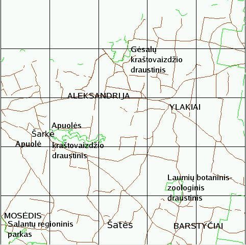 ![]() Apuolės apylinkių keliai ir saugomų teritorijų ribos. Lapo "Ylakiai" adm.e00, infra.e00 ir km5.e00 sluoksniai GRASS-57 formate. |