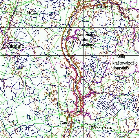 tarnyba, 1998.Kretingos apylinkių reljefas, hidrografija, keliai ir saugomų teritorijų ribos. Lapo "Kretinga" elev.e00, rivers.e00, infra.e.00, adm.e00 ir km5.e00 sluoksniai GRASS-61 formate. |