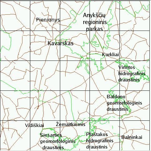 Žemaitkiemio apylinkės. Saugomų teritorijų ribos.Lapo "Kavarskas" adm.e00 ir km5.e00 sluoksniai GRASS-57 formate. |